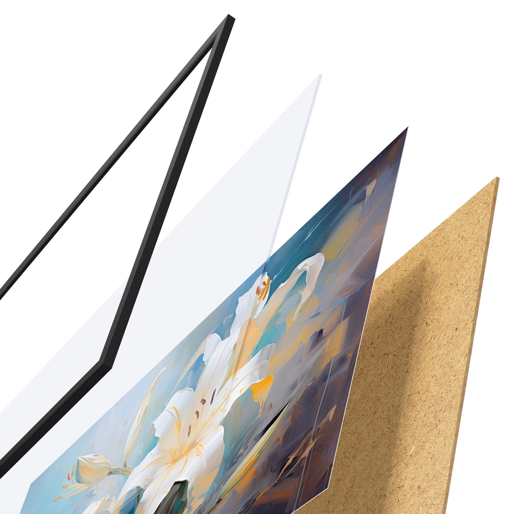 El póster consta de marco, plexiglás, imagen impresa y soporte de aglomerado. El póster puede colgarse inmediatamente en la pared gracias a los soportes de la parte posterior.