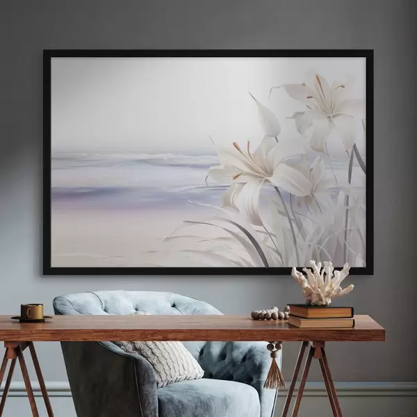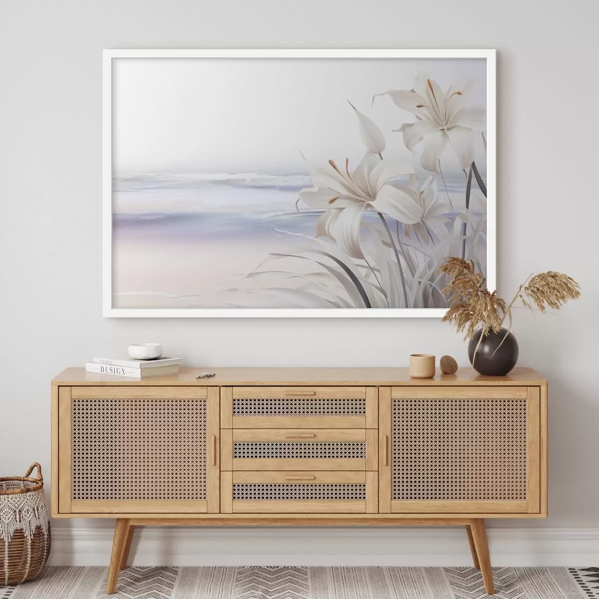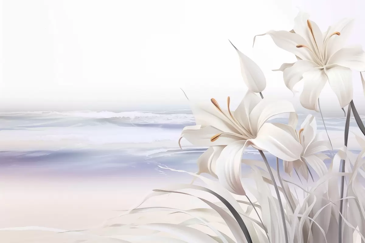 Poster Lirios blancos con pistilos naranjas y hojas largas en una playa con suaves olas de fondo, colores pastel Nr f44850