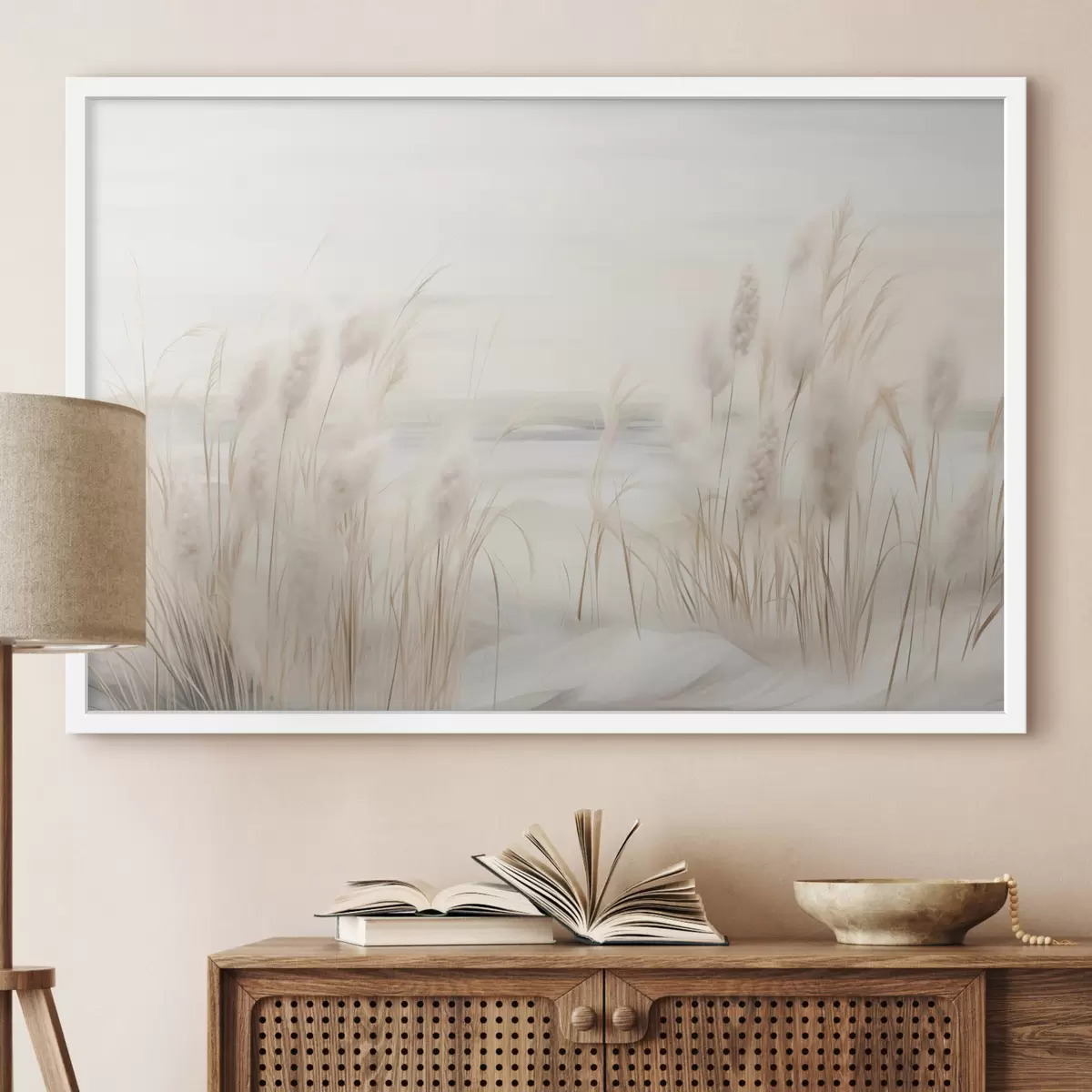 Poster Cañas beige en primer plano, con cabezas de semillas, suaves y delicadas , un fondo borroso y un cielo claro Nr f44851