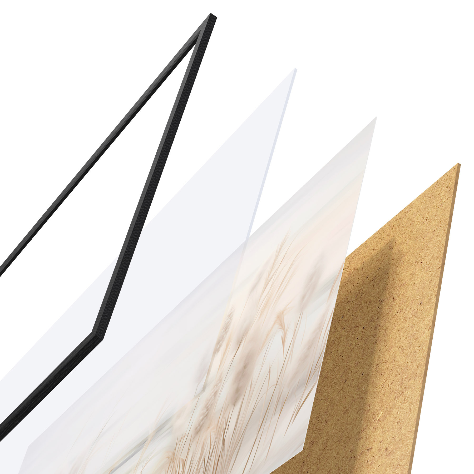 El póster consta de marco, plexiglás, imagen impresa y soporte de aglomerado. El póster puede colgarse inmediatamente en la pared gracias a los soportes de la parte posterior.
