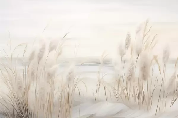 Poster Cañas beige en primer plano, con cabezas de semillas, suaves y delicadas , un fondo borroso y un cielo claro Nr f44851