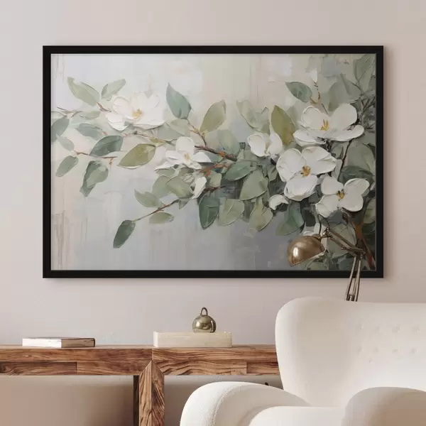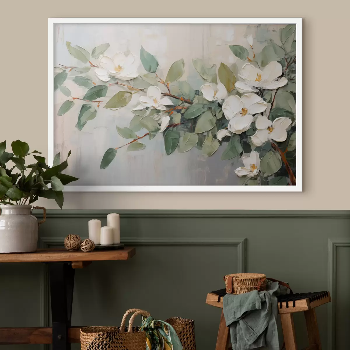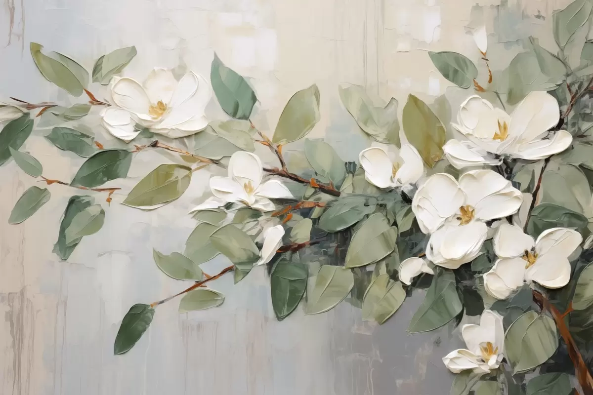 Poster Flores de magnolia con hojas verdes en una rama, estilo de textura impasto, paleta de colores suaves Nr f44853