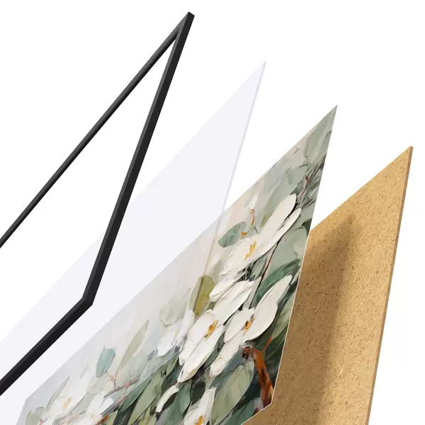 El póster consta de marco, plexiglás, imagen impresa y soporte de aglomerado. El póster puede colgarse inmediatamente en la pared gracias a los soportes de la parte posterior.