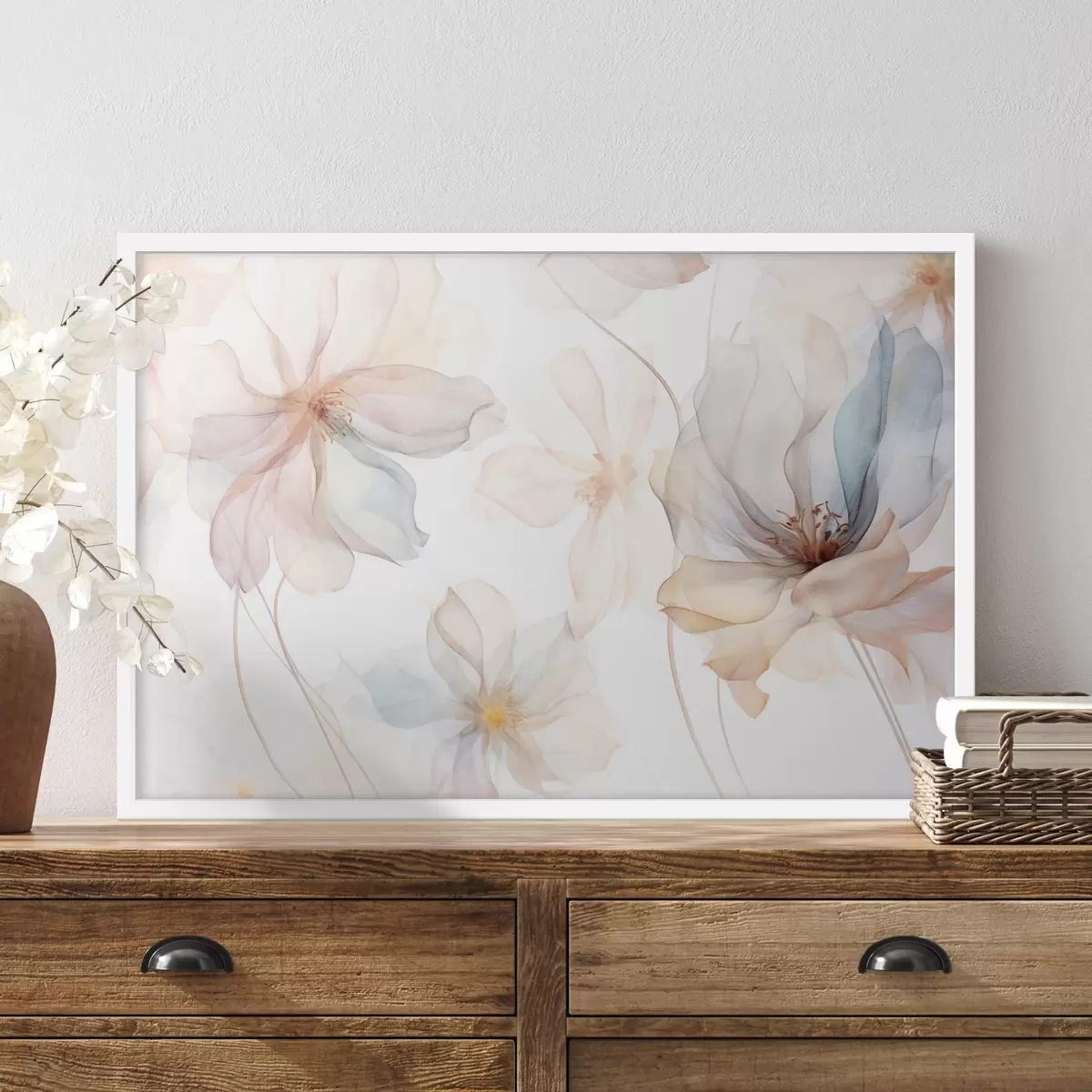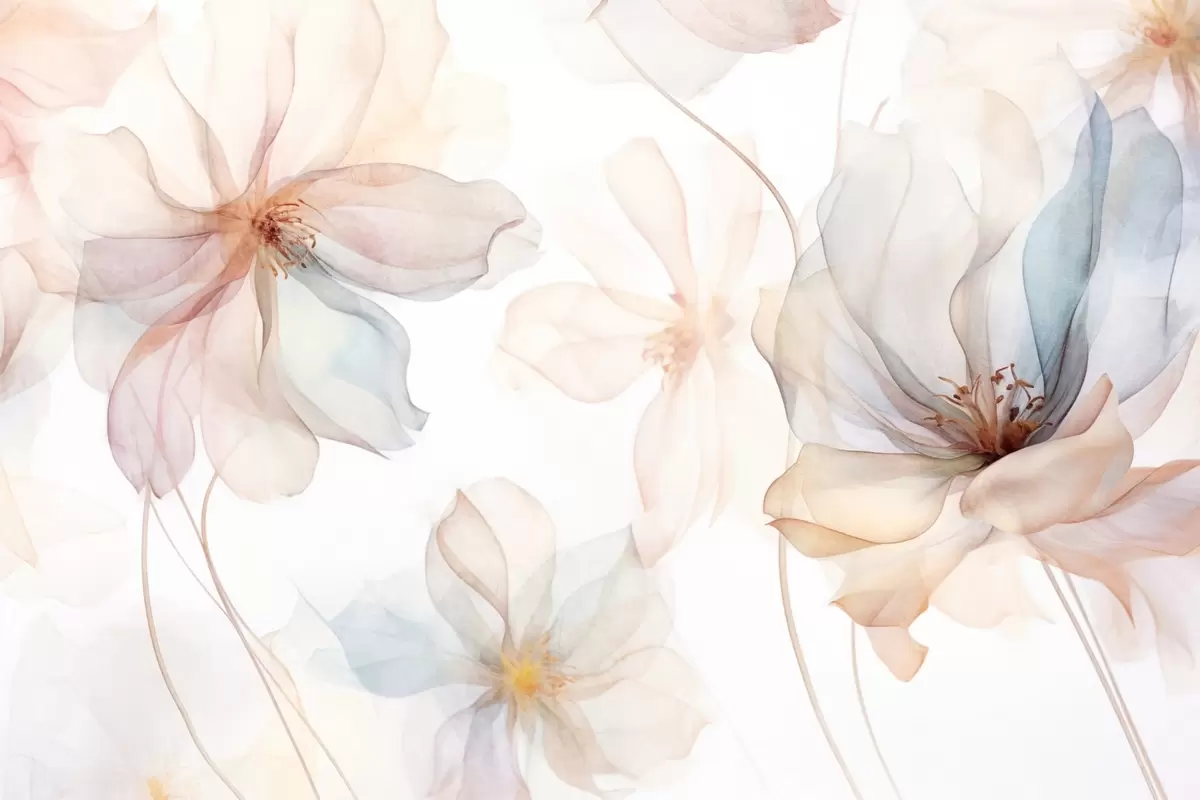 Poster Flores de textura translúcida en colores pastel, pétalos delicados, líneas delicadas sobre fondo blanco Nr f44855