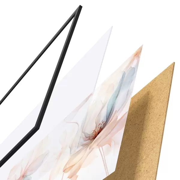 El póster consta de marco, plexiglás, imagen impresa y soporte de aglomerado. El póster puede colgarse inmediatamente en la pared gracias a los soportes de la parte posterior.