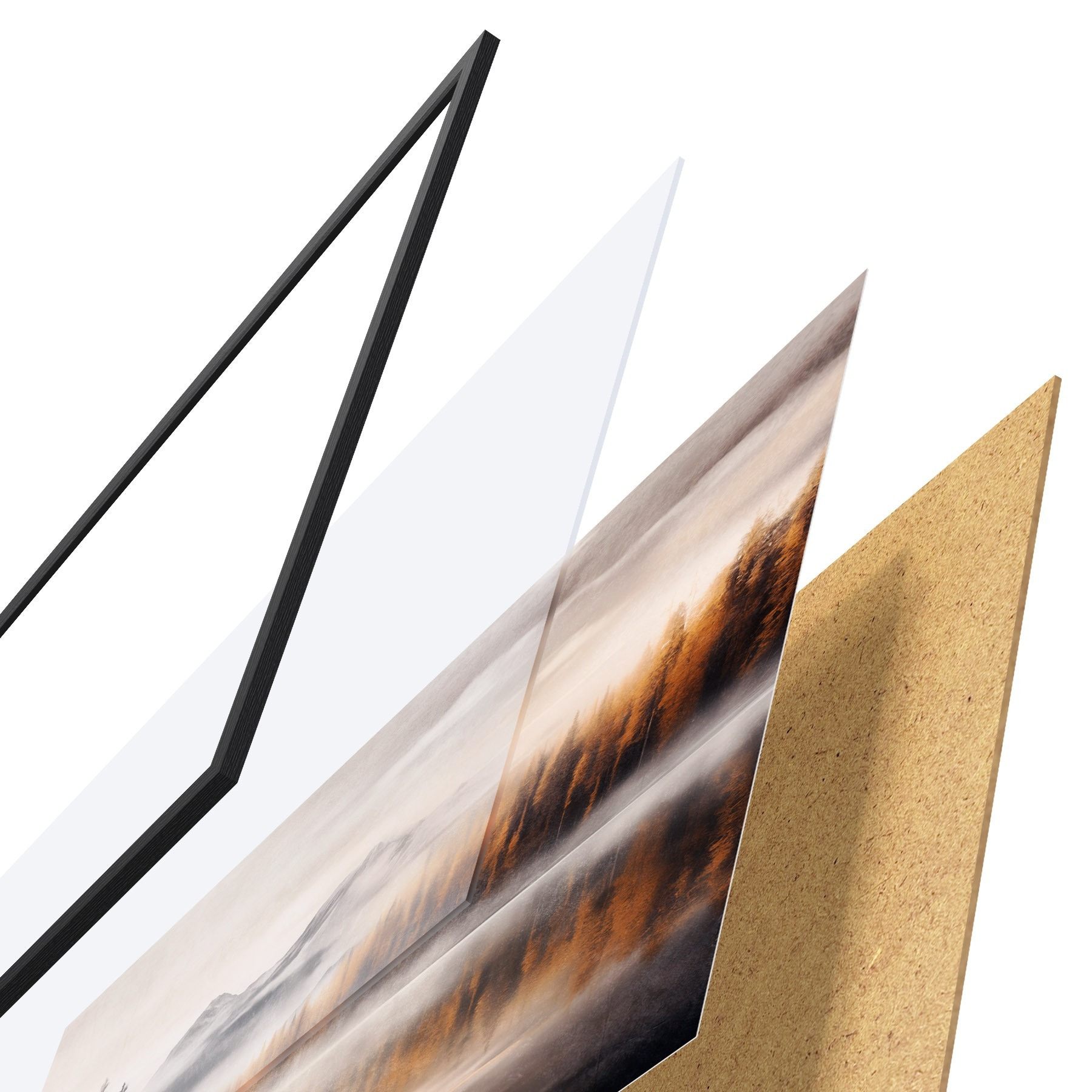 El póster consta de marco, plexiglás, imagen impresa y soporte de aglomerado. El póster puede colgarse inmediatamente en la pared gracias a los soportes de la parte posterior.