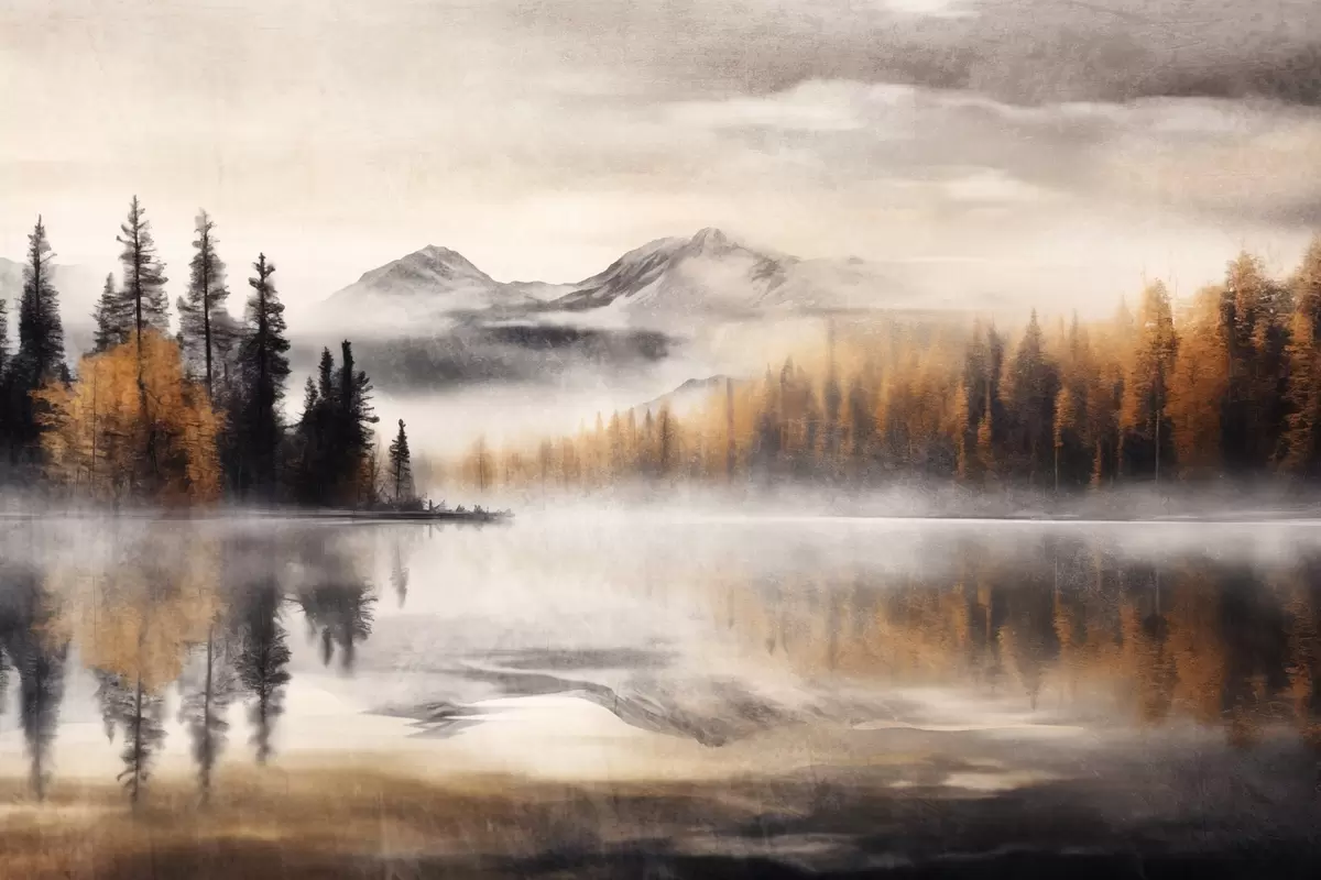 Poster Un paisaje lacustre de textura brumosa con pinos y montañas, cielo gris nublado Nr f44856