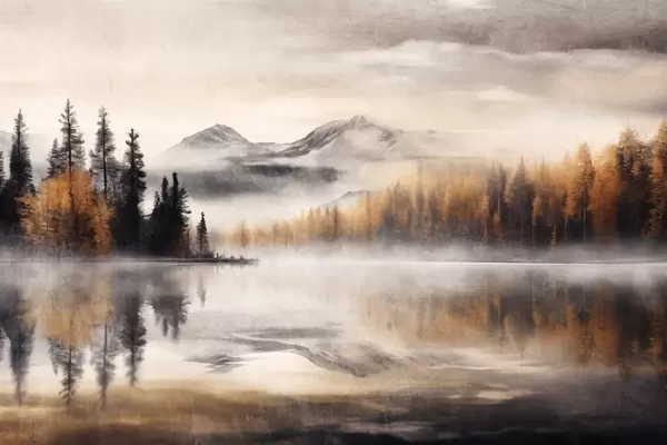 Poster Un paisaje lacustre de textura brumosa con pinos y montañas, cielo gris nublado f44856