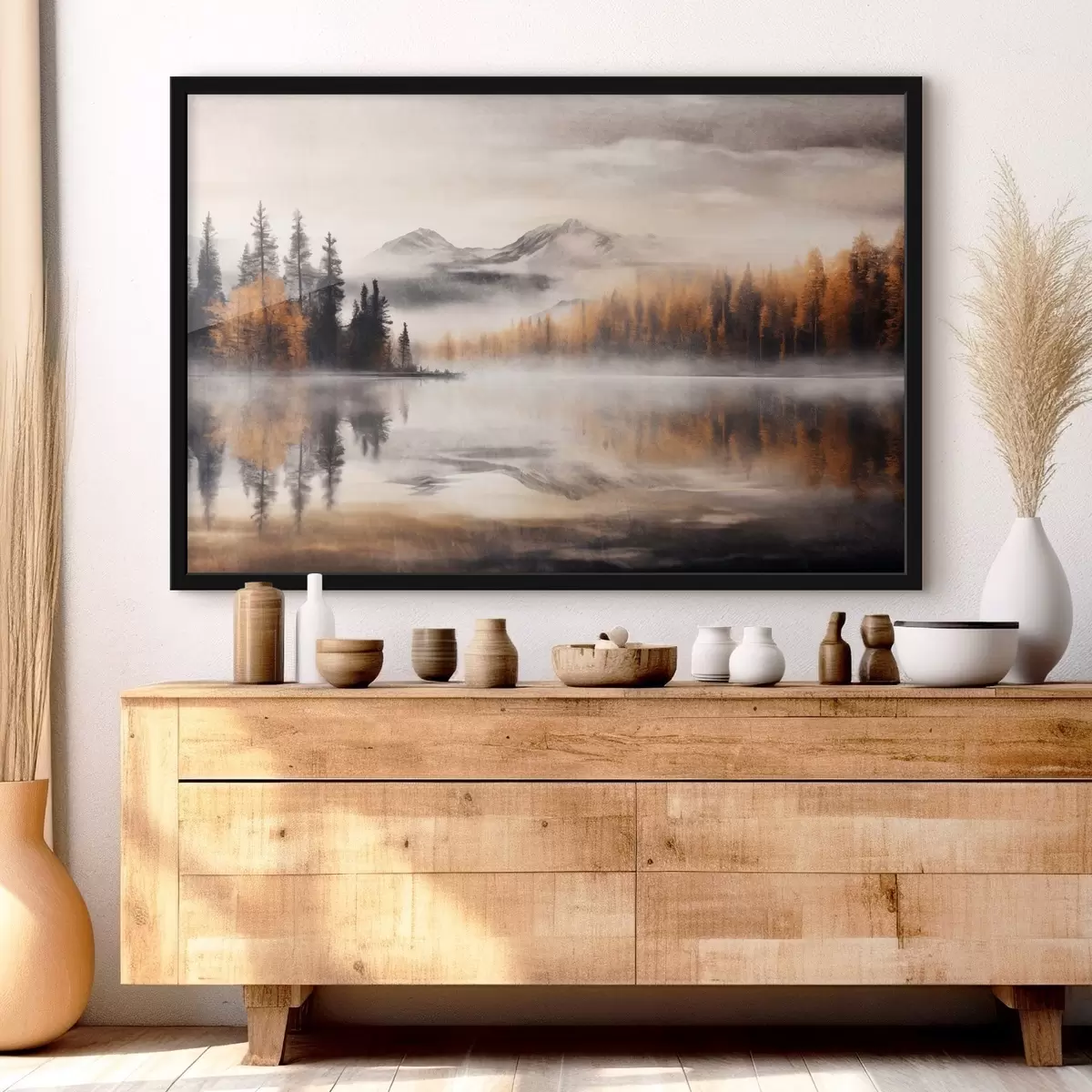 Poster Un paisaje lacustre de textura brumosa con pinos y montañas, cielo gris nublado f44856