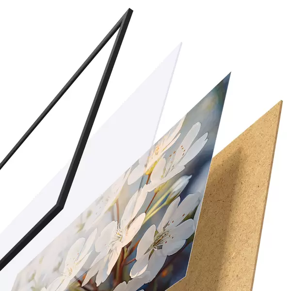 El póster consta de marco, plexiglás, imagen impresa y soporte de aglomerado. El póster puede colgarse inmediatamente en la pared gracias a los soportes de la parte posterior.