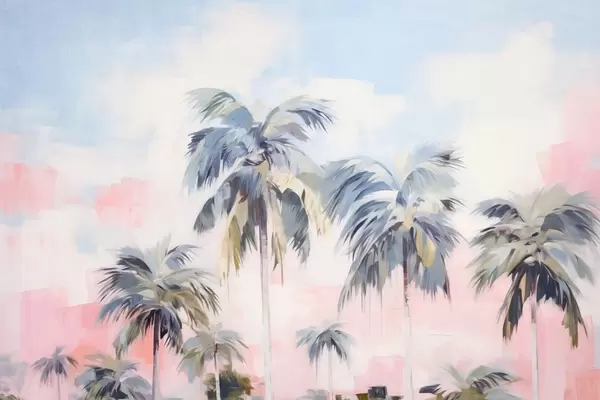 Poster Palmeras con hojas de colores pastel y troncos marrones, cielo rosa y azul, ambiente tropical Nr f44866