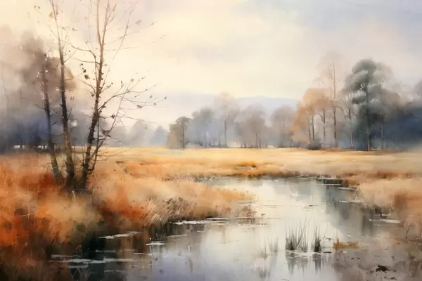 Poster Una pintura de paisaje de textura tranquila imitación de juncos y árboles desnudos, el agua tranquila bajo un cielo Nr f44867