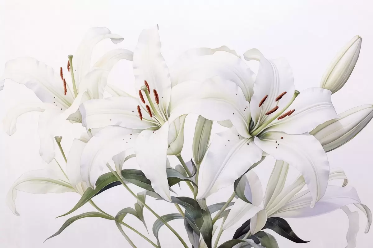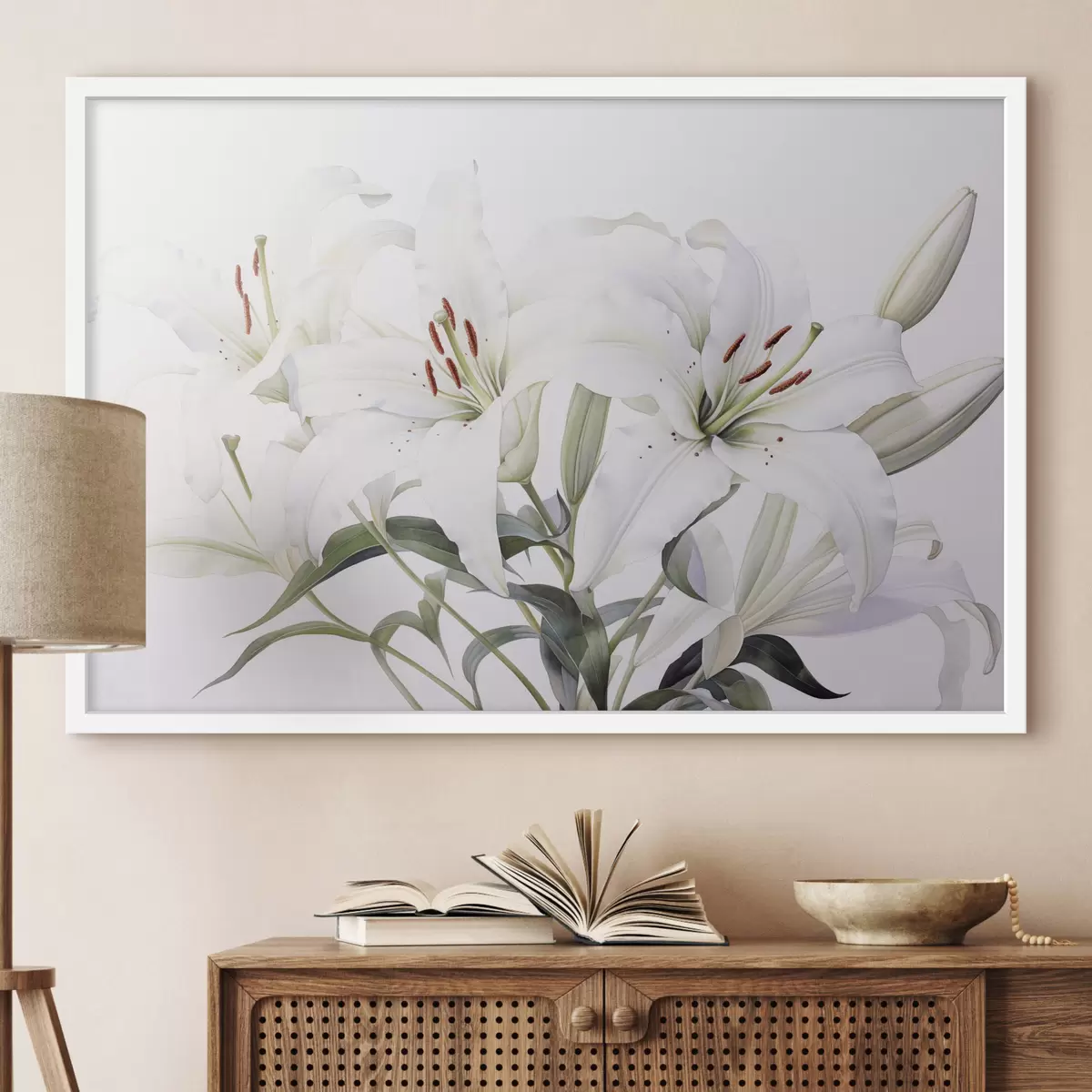 Poster Un ramo de lirios blancos con hojas verdes, delicados pétalos y suave fondo blanco Nr f44868