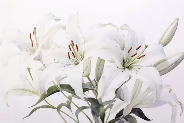 Poster Un ramo de lirios blancos con hojas verdes, delicados pétalos y suave fondo blanco f44868