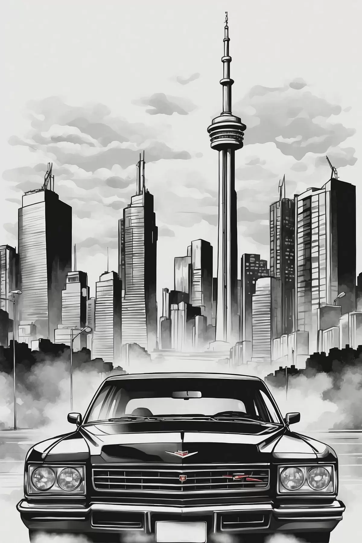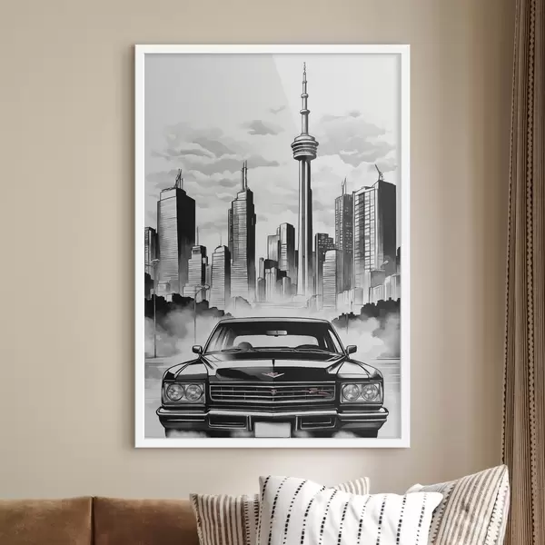 Poster Coche retro en el fondo de la ciudad monocromo con rascacielos f44871