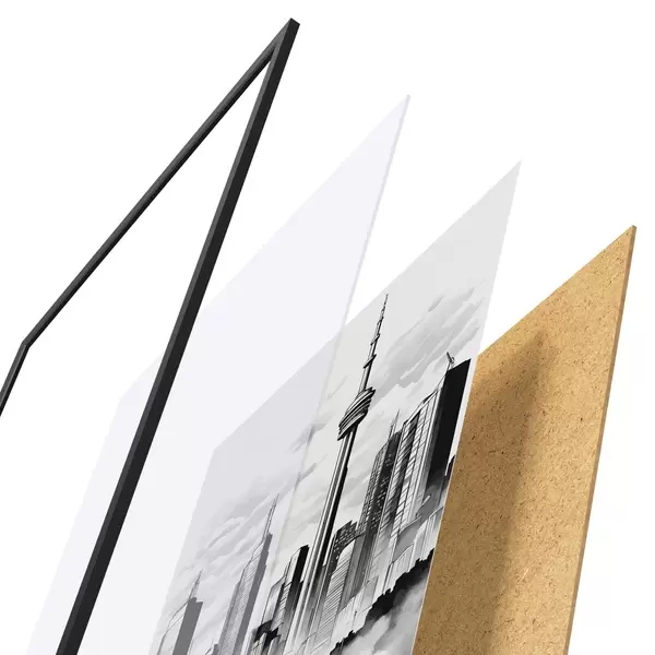 El póster consta de marco, plexiglás, imagen impresa y soporte de aglomerado. El póster puede colgarse inmediatamente en la pared gracias a los soportes de la parte posterior.