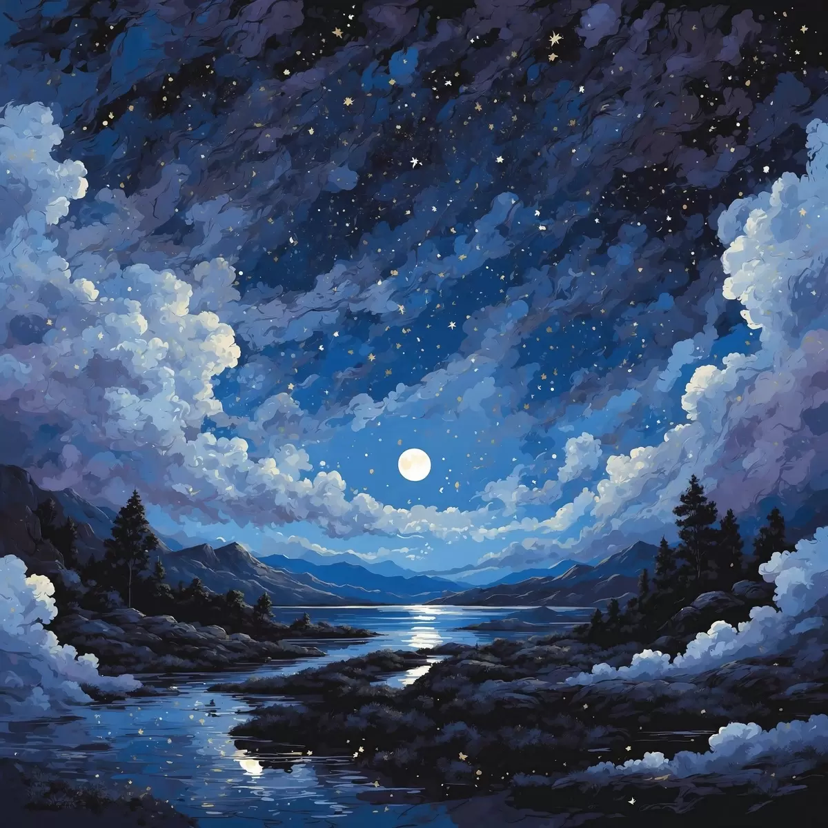 Poster Cielo nocturno con luna y estrellas sobre paisaje de montaña f44872