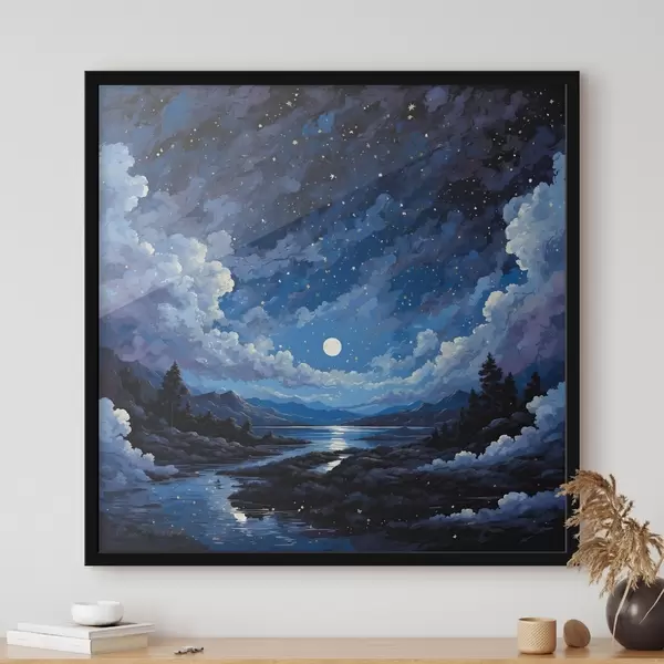 Poster Cielo nocturno con luna y estrellas sobre paisaje de montaña Nr f44872