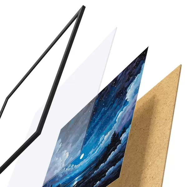 El póster consta de marco, plexiglás, imagen impresa y soporte de aglomerado. El póster puede colgarse inmediatamente en la pared gracias a los soportes de la parte posterior.
