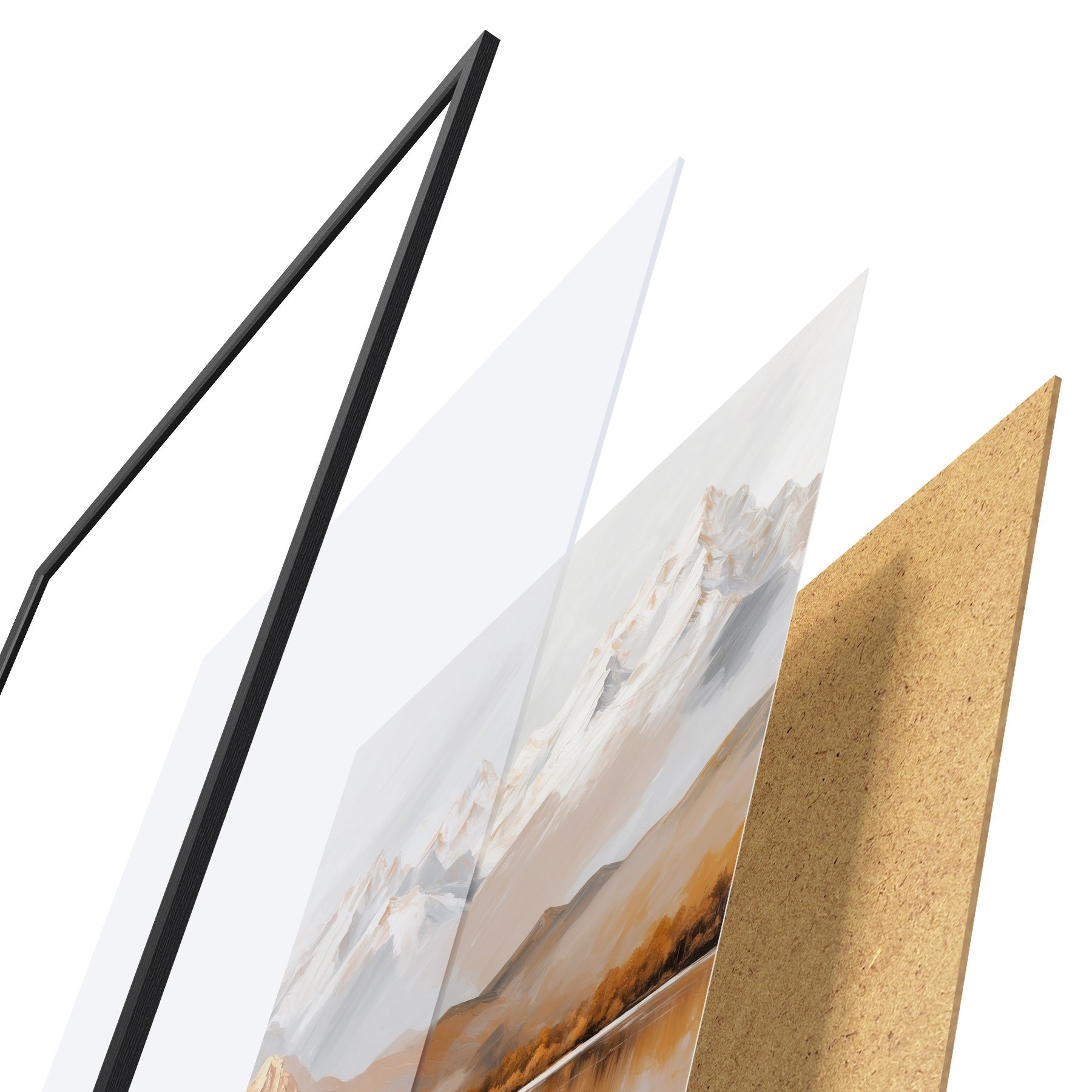 El póster consta de marco, plexiglás, imagen impresa y soporte de aglomerado. El póster puede colgarse inmediatamente en la pared gracias a los soportes de la parte posterior.