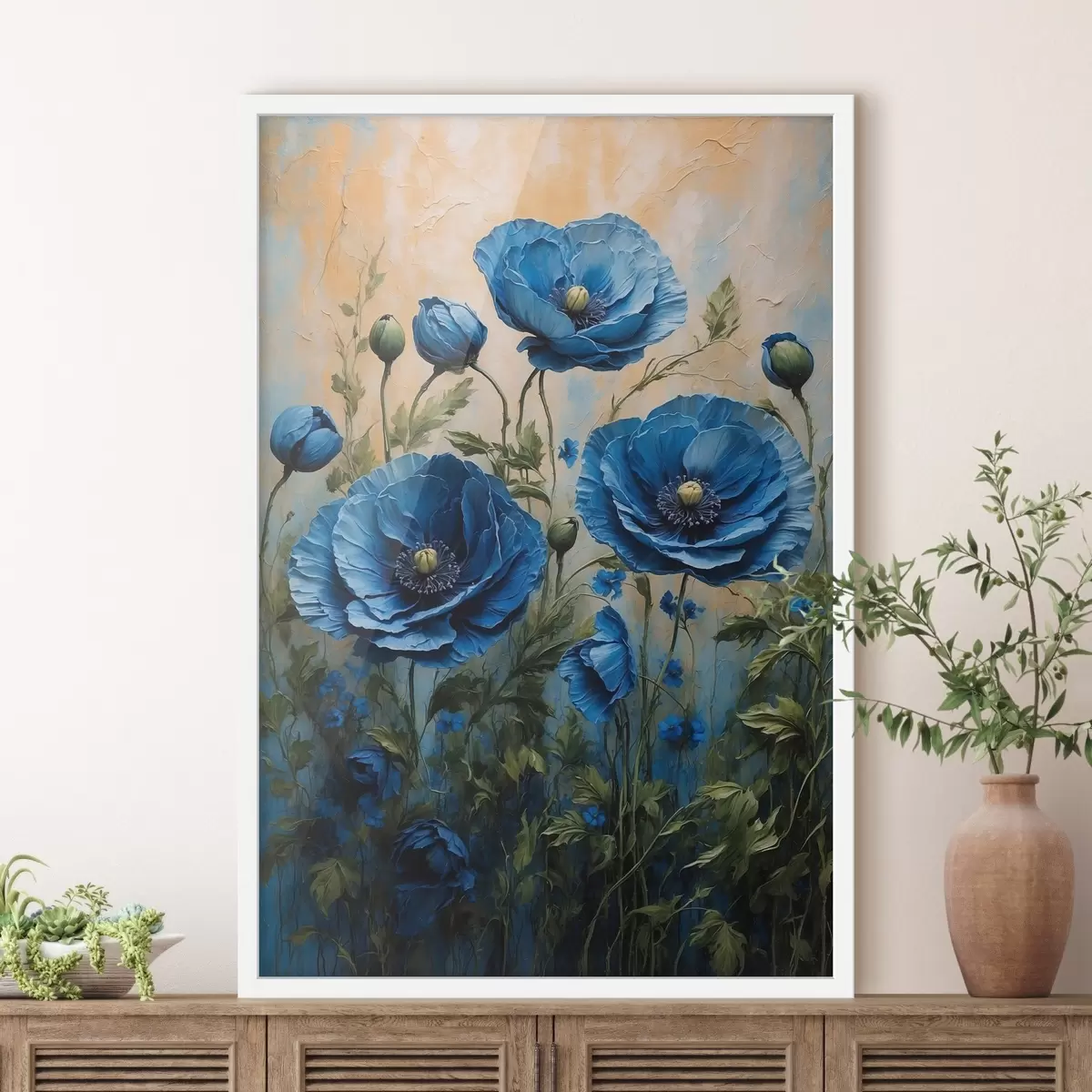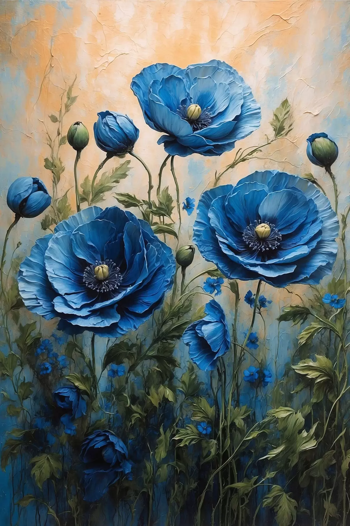Poster Amapolas azules sobre fondo pastel con hojas Nr f44882