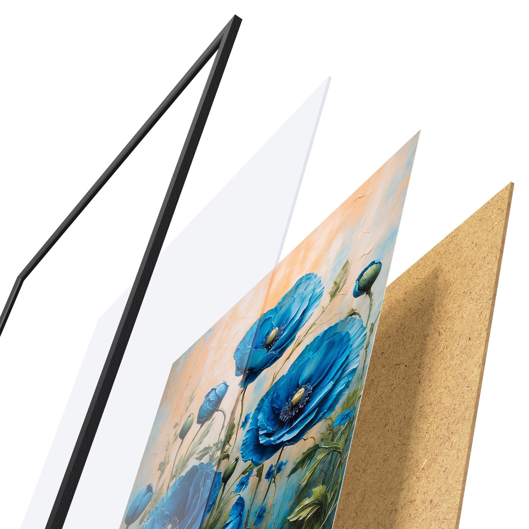El póster consta de marco, plexiglás, imagen impresa y soporte de aglomerado. El póster puede colgarse inmediatamente en la pared gracias a los soportes de la parte posterior.