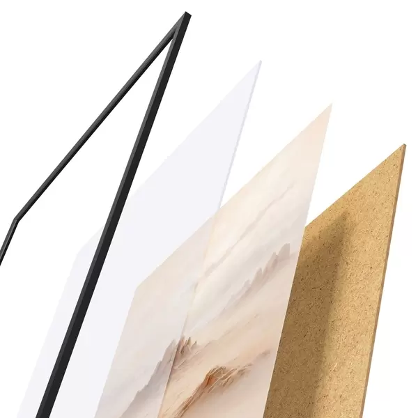 El póster consta de marco, plexiglás, imagen impresa y soporte de aglomerado. El póster puede colgarse inmediatamente en la pared gracias a los soportes de la parte posterior.