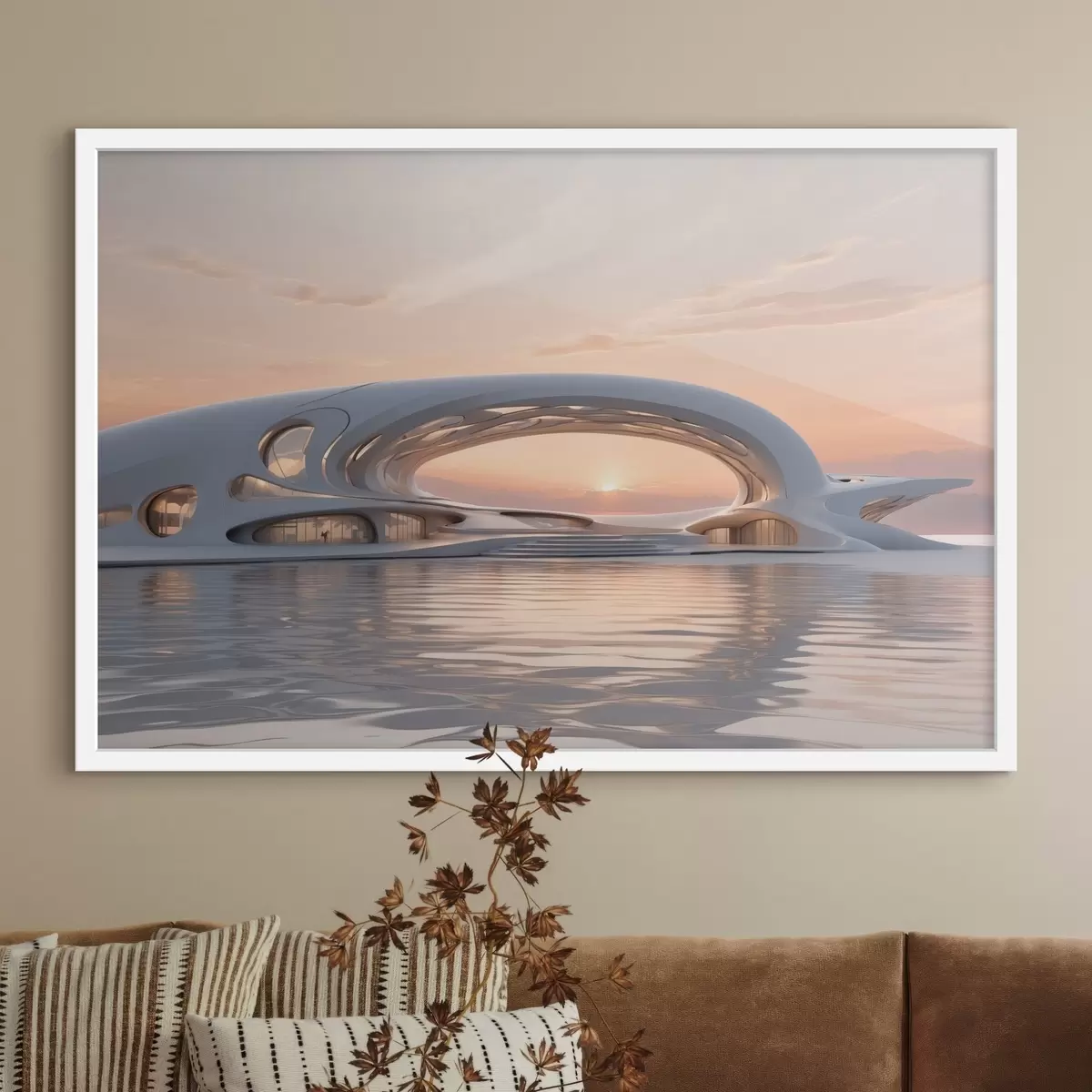 Poster Edificio futurista sobre el agua contra una puesta de sol rosa Nr f44884