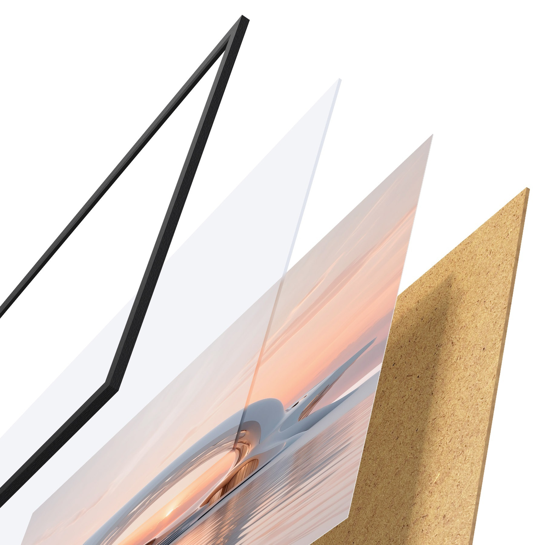 El póster consta de marco, plexiglás, imagen impresa y soporte de aglomerado. El póster puede colgarse inmediatamente en la pared gracias a los soportes de la parte posterior.
