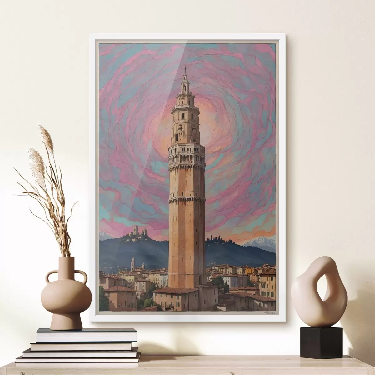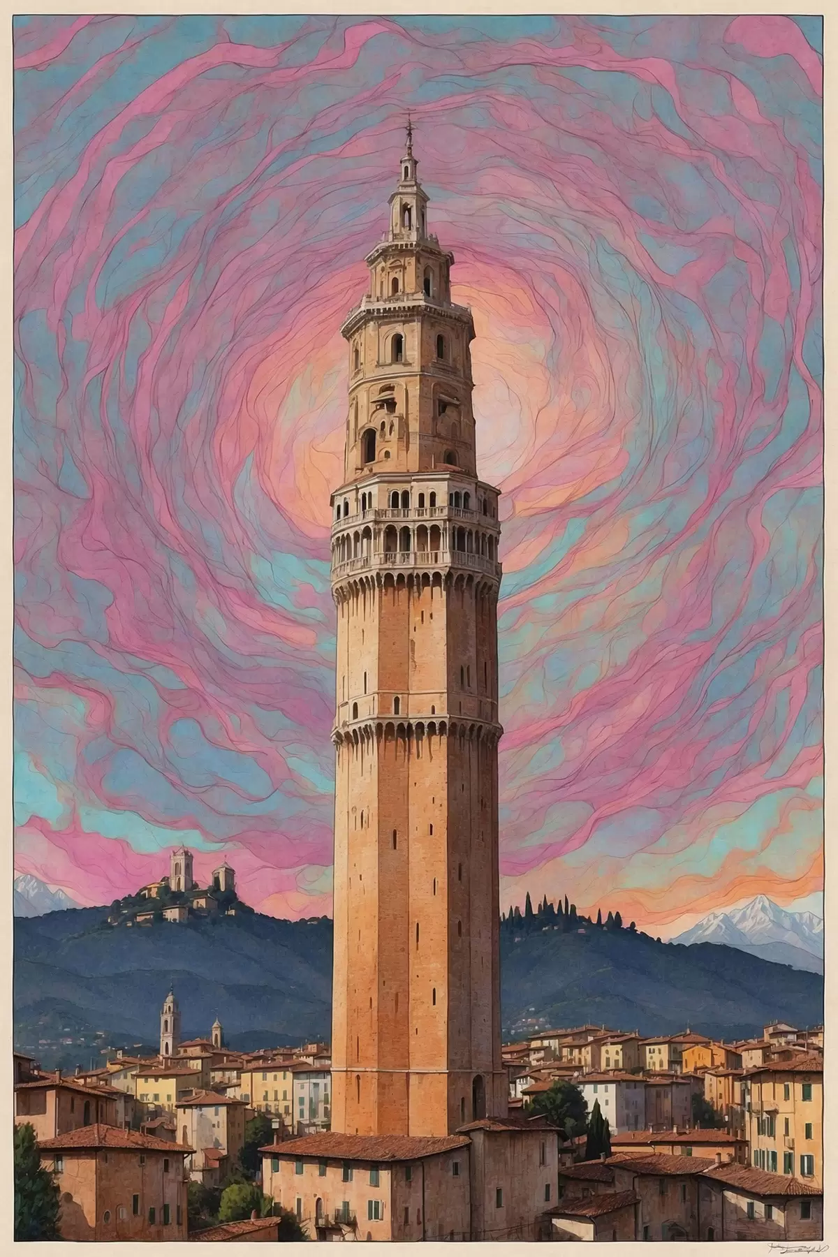 Poster Torre de fantasía contra el cielo con espirales rosas y azules f44885