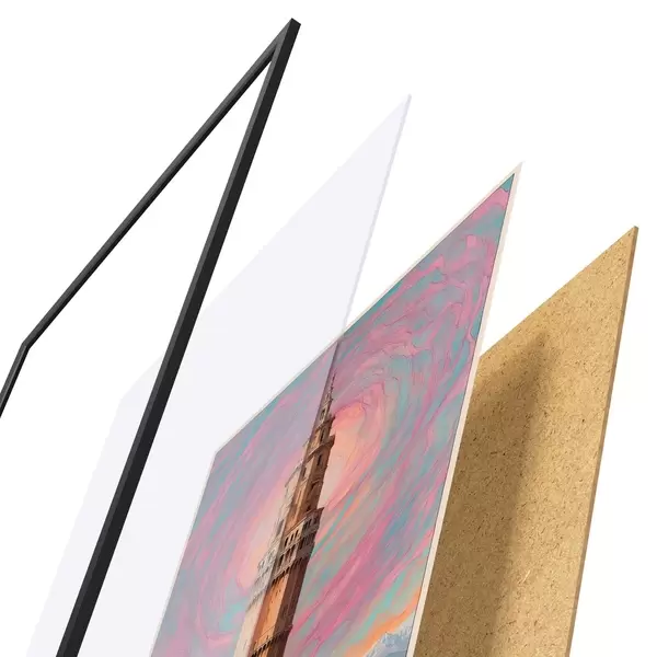 El póster consta de marco, plexiglás, imagen impresa y soporte de aglomerado. El póster puede colgarse inmediatamente en la pared gracias a los soportes de la parte posterior.