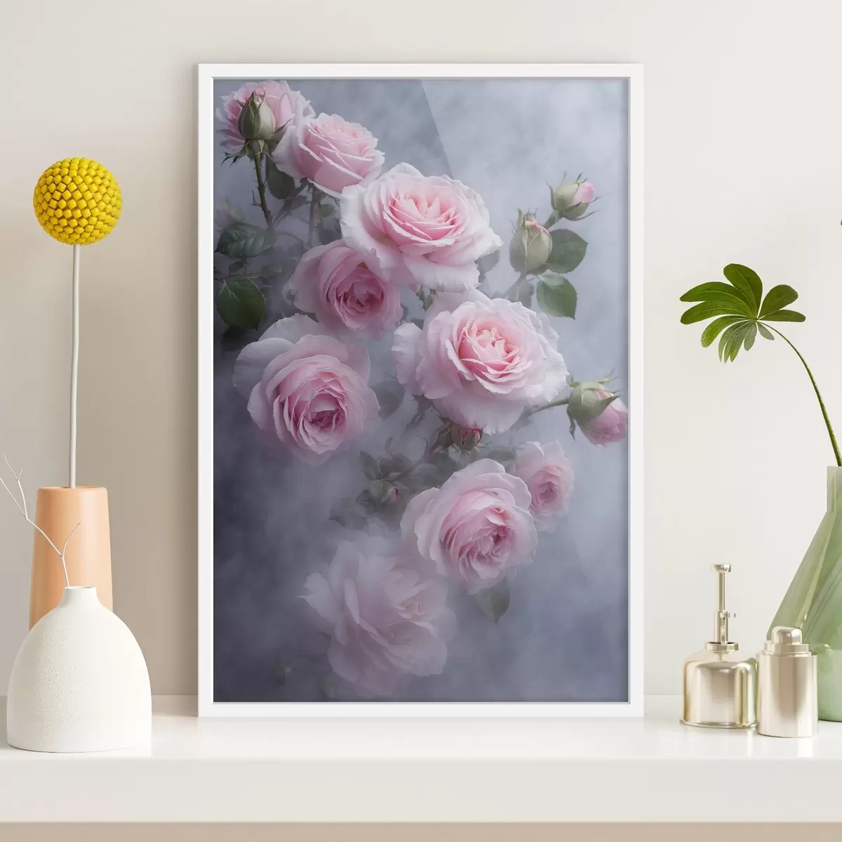 Poster Rosas suavemente rosadas en la niebla con hojas verdes f44892