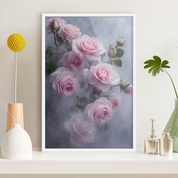 Poster Rosas suavemente rosadas en la niebla con hojas verdes Nr f44892
