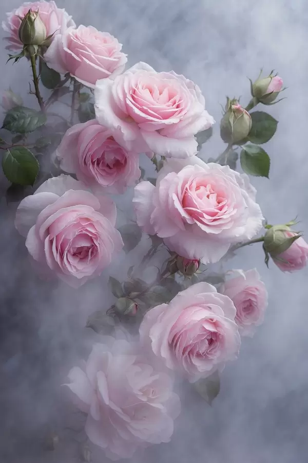 Poster Rosas suavemente rosadas en la niebla con hojas verdes Nr f44892