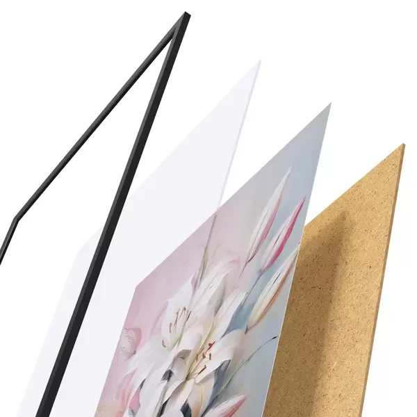 El póster consta de marco, plexiglás, imagen impresa y soporte de aglomerado. El póster puede colgarse inmediatamente en la pared gracias a los soportes de la parte posterior.