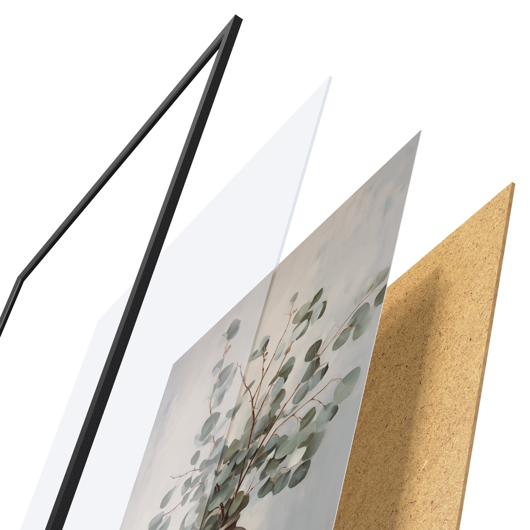 El póster consta de marco, plexiglás, imagen impresa y soporte de aglomerado. El póster puede colgarse inmediatamente en la pared gracias a los soportes de la parte posterior.