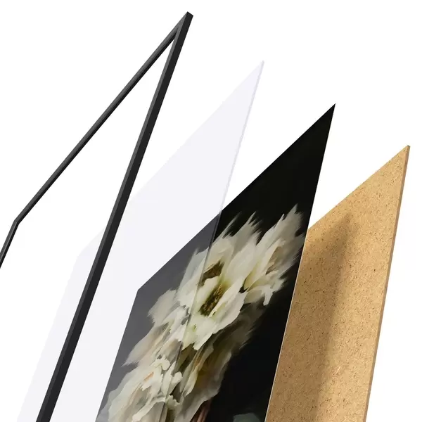 El póster consta de marco, plexiglás, imagen impresa y soporte de aglomerado. El póster puede colgarse inmediatamente en la pared gracias a los soportes de la parte posterior.