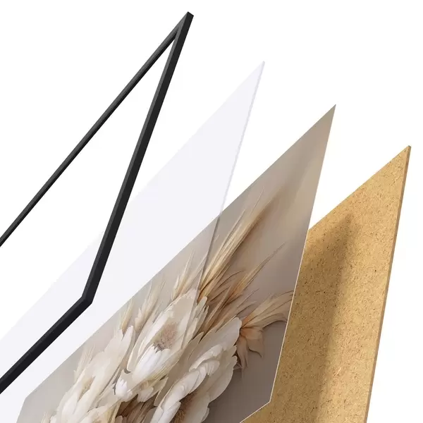El póster consta de marco, plexiglás, imagen impresa y soporte de aglomerado. El póster puede colgarse inmediatamente en la pared gracias a los soportes de la parte posterior.