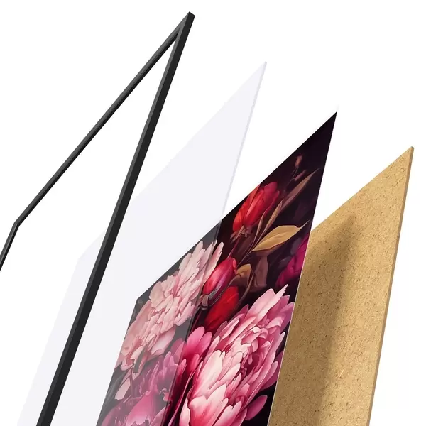 El póster consta de marco, plexiglás, imagen impresa y soporte de aglomerado. El póster puede colgarse inmediatamente en la pared gracias a los soportes de la parte posterior.