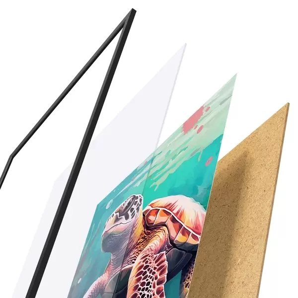El póster consta de marco, plexiglás, imagen impresa y soporte de aglomerado. El póster puede colgarse inmediatamente en la pared gracias a los soportes de la parte posterior.