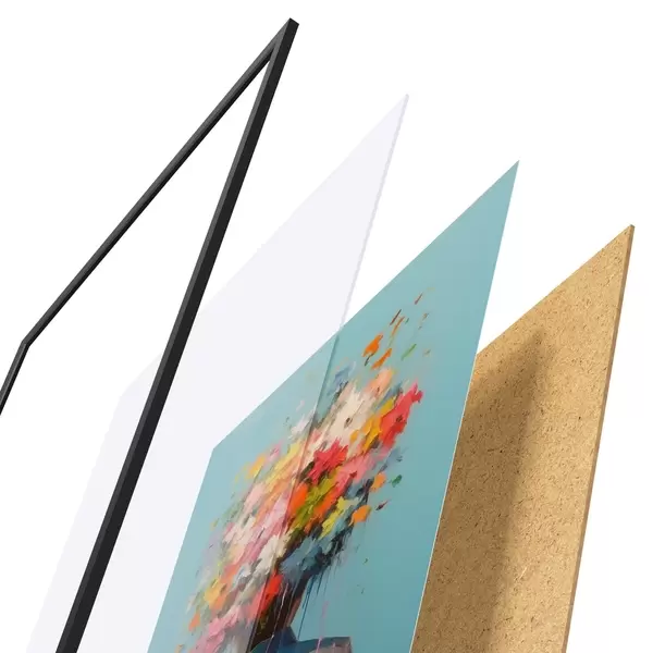 El póster consta de marco, plexiglás, imagen impresa y soporte de aglomerado. El póster puede colgarse inmediatamente en la pared gracias a los soportes de la parte posterior.
