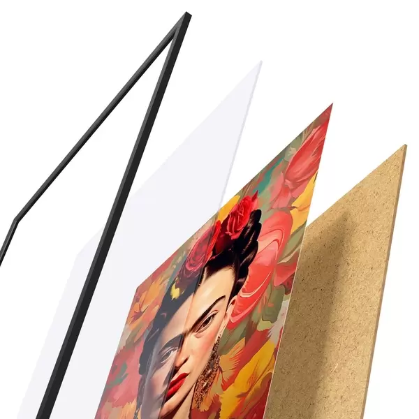 El póster consta de marco, plexiglás, imagen impresa y soporte de aglomerado. El póster puede colgarse inmediatamente en la pared gracias a los soportes de la parte posterior.
