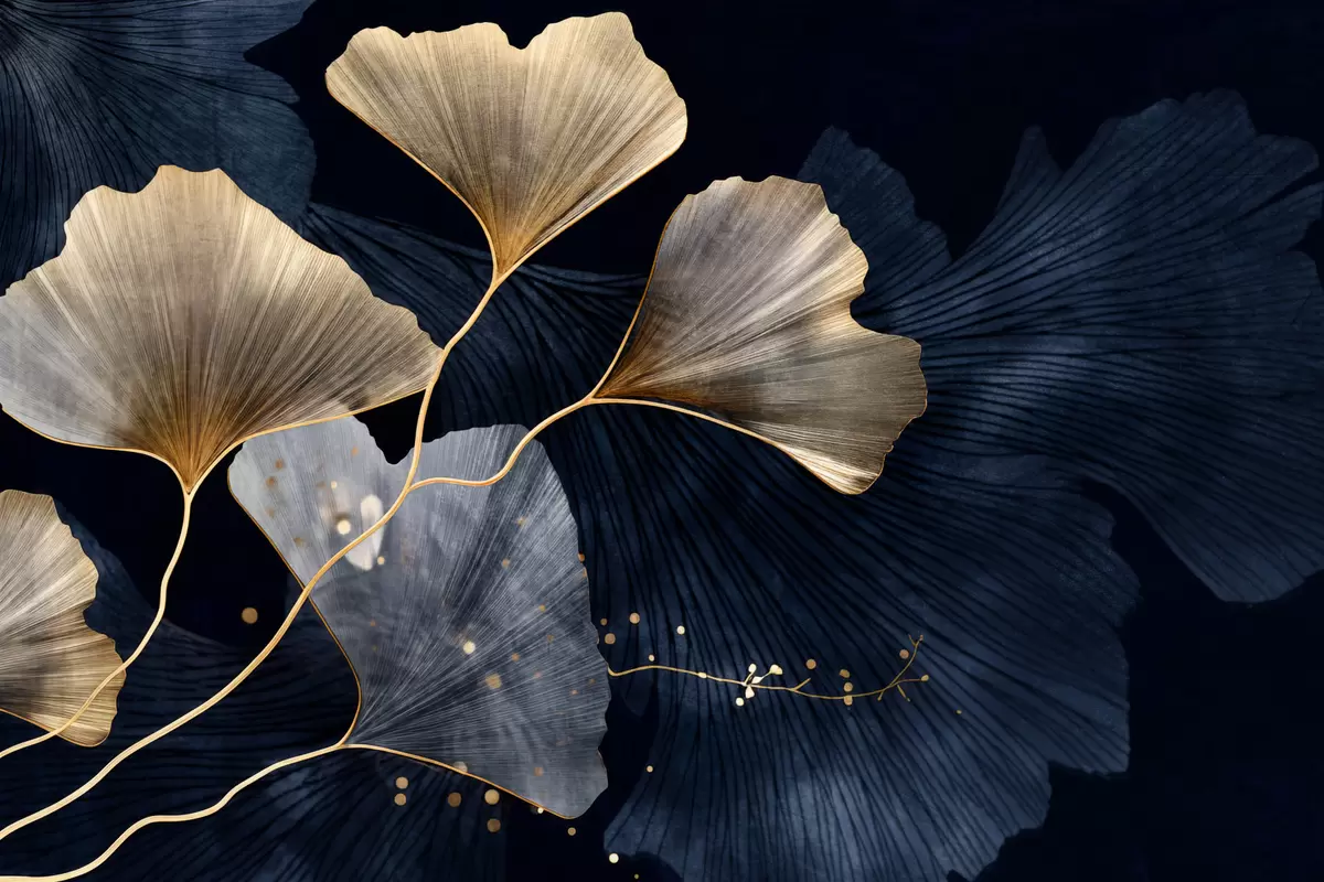 Poster Hojas de ginkgo en tonos amarillos y azules, elegante fondo oscuro, arte moderno, estilo minimalista, inspirado en la naturaleza Nr f44921