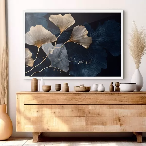 Poster Hojas de ginkgo en tonos amarillos y azules, elegante fondo oscuro, arte moderno, estilo minimalista, inspirado en la naturaleza f44921