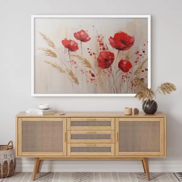 Poster Flores rojas de amapola con tallos amarillos de trigo, sobre un fondo suave y neutro con salpicaduras de pintura roja Nr f44926