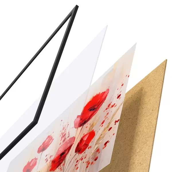 El póster consta de marco, plexiglás, imagen impresa y soporte de aglomerado. El póster puede colgarse inmediatamente en la pared gracias a los soportes de la parte posterior.