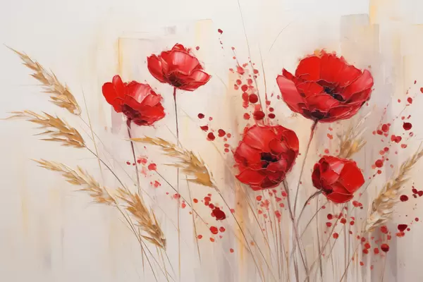 Poster Flores rojas de amapola con tallos amarillos de trigo, sobre un fondo suave y neutro con salpicaduras de pintura roja Nr f44926