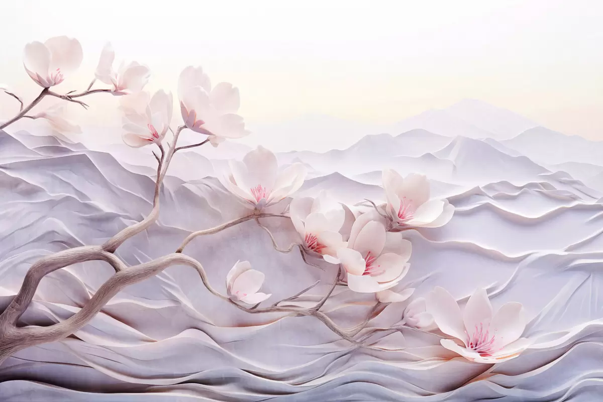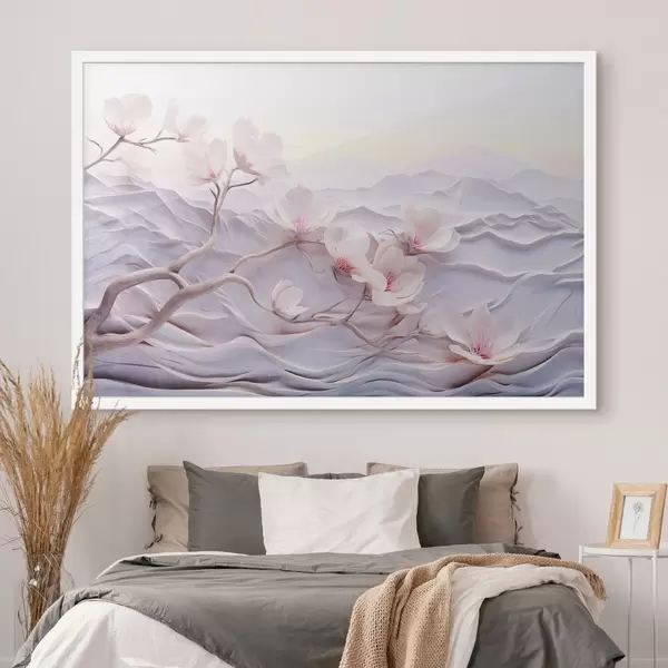Poster Rama florecida con flores rosas, montañas al fondo, suaves colores pastel, arte japonés con textura Nr f44930