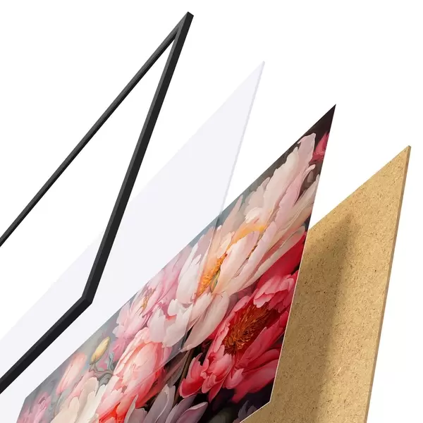 El póster consta de marco, plexiglás, imagen impresa y soporte de aglomerado. El póster puede colgarse inmediatamente en la pared gracias a los soportes de la parte posterior.