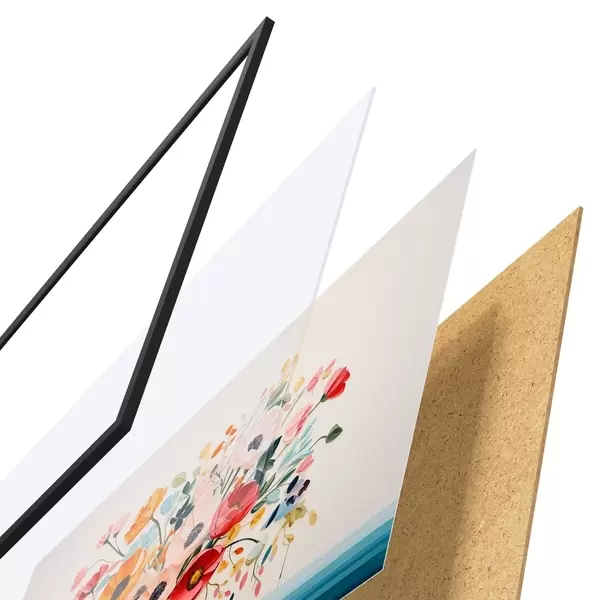 El póster consta de marco, plexiglás, imagen impresa y soporte de aglomerado. El póster puede colgarse inmediatamente en la pared gracias a los soportes de la parte posterior.